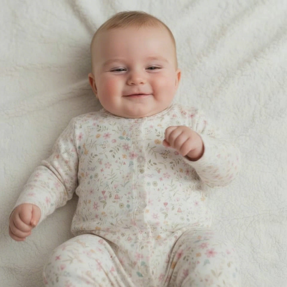 Enjoy sweet moments in Fairy Garden style! This enchanting romper is adorned with pretty flowers and cute woodland creatures, like playful squirrels and beautiful birds. The delicate ruffles along the closure add a sweet and gentle touch. For easy dressing and diaper changes, it features a full front opening with snap fasteners at the center and crotch. Made from soft organic cotton, it guarantees a gentle and comfortable fit for your child. Pair it with a matching bodysuit for a coordinated look or with other items from the Fairy Garden collection.