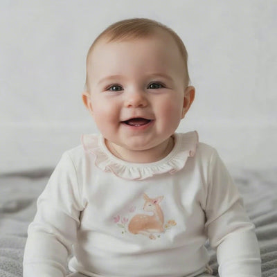 Hello deer! Made from soft organic cotton, this t-shirt features an adorable scene from the fairy garden, where a deer enjoys the beauty of the surrounding flowers. The neckline is finished with delicate ruffles for a touch of sweetness. With its long sleeves and convenient snap closures at the shoulder, this t-shirt is comfortable and easy to slip on. It's designed to coordinate effortlessly with all the pieces in the Fairy Garden collection, opening up a world of endless styling possibilities.